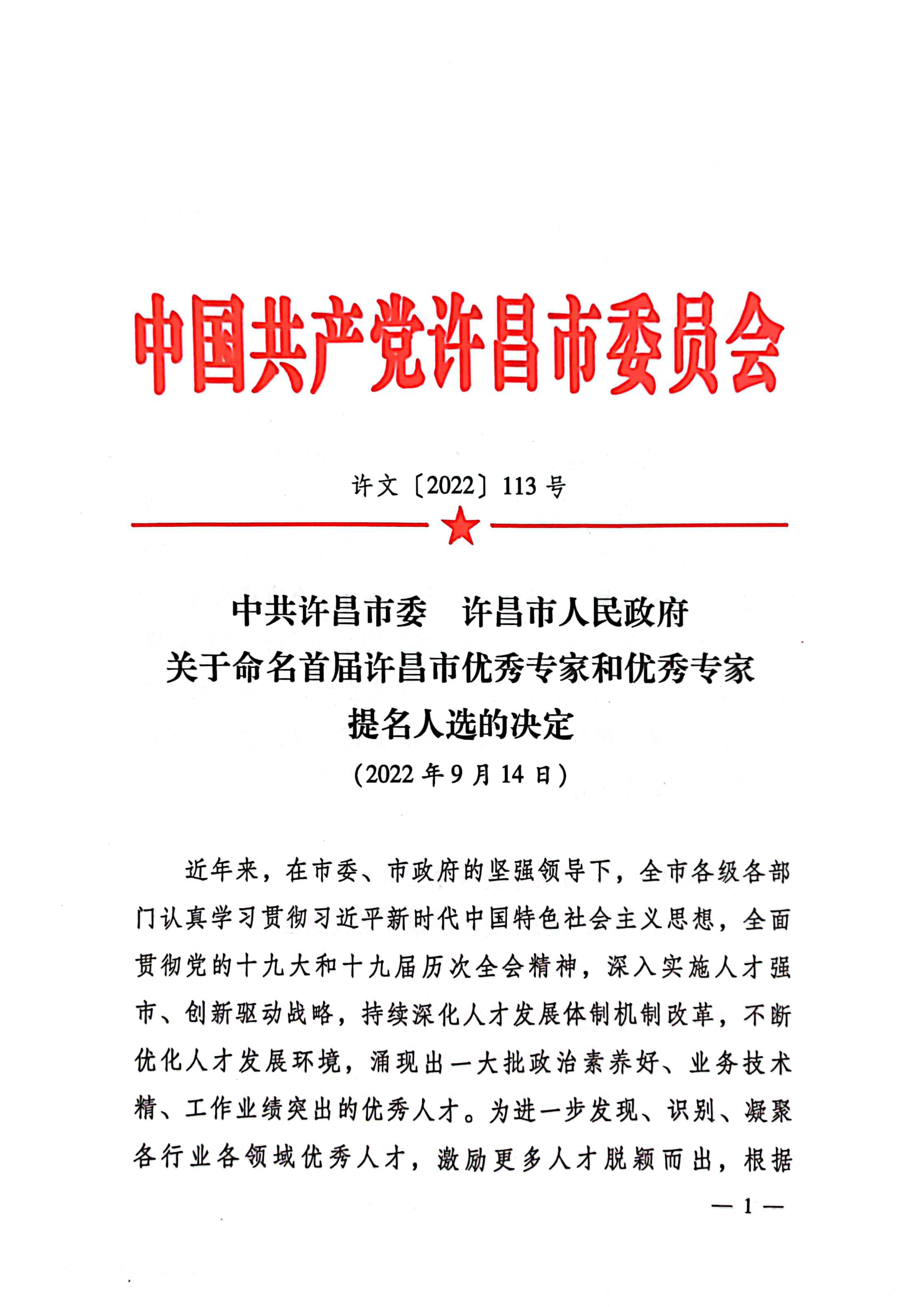 9 月 14 日,公司總經理劉剛在許昌市委人才工作會議上,被授予“首屆許昌市優秀專家”稱號。