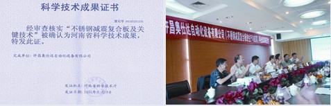9月19日,公司不銹鋼減震復合板項目順利取得了省科技廳頒發的科技成果鑒定證書。至此,公司打破了國內不能生產不銹鋼減震復合板的局面,填補了國內行業空白。