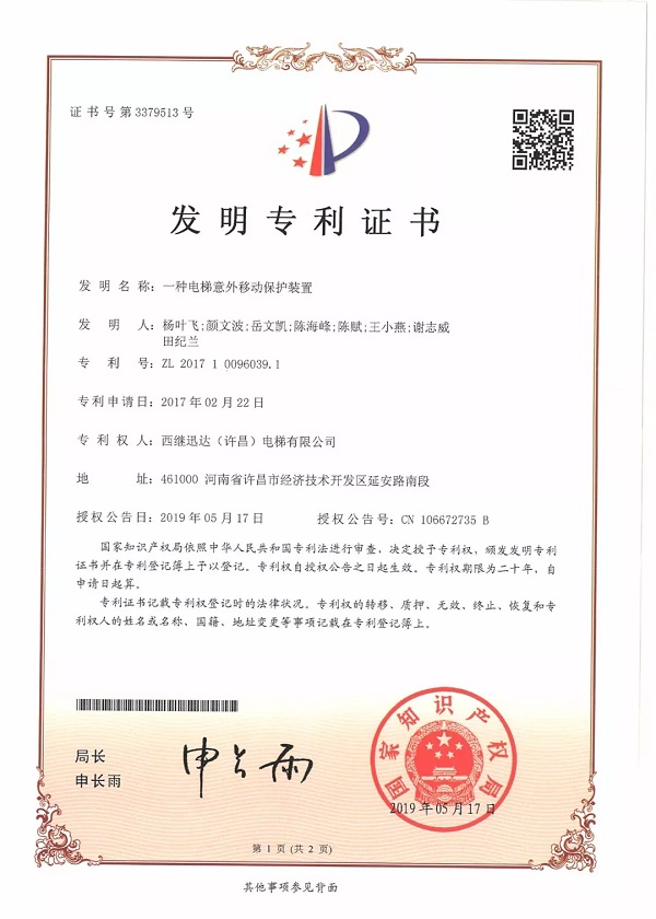 日前,“一種電梯意外移動保護裝置”被正式授予發明專利證書。專利權人為西繼迅達電梯,專利號為ZL201710096039.1,該專利于2017年2月22日申請,授權公告日為2019年5月17日,授予公告號為CN106672735B。