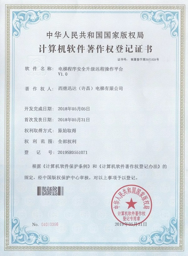 2019年5月31日,《電梯程序安全升級(jí)遠(yuǎn)程操作平臺(tái)》被正式授予《中華人民共和國(guó)國(guó)家版權(quán)局計(jì)算機(jī)軟件著作權(quán)登記證書(shū)》,登記號(hào)為:2019SR0551071。