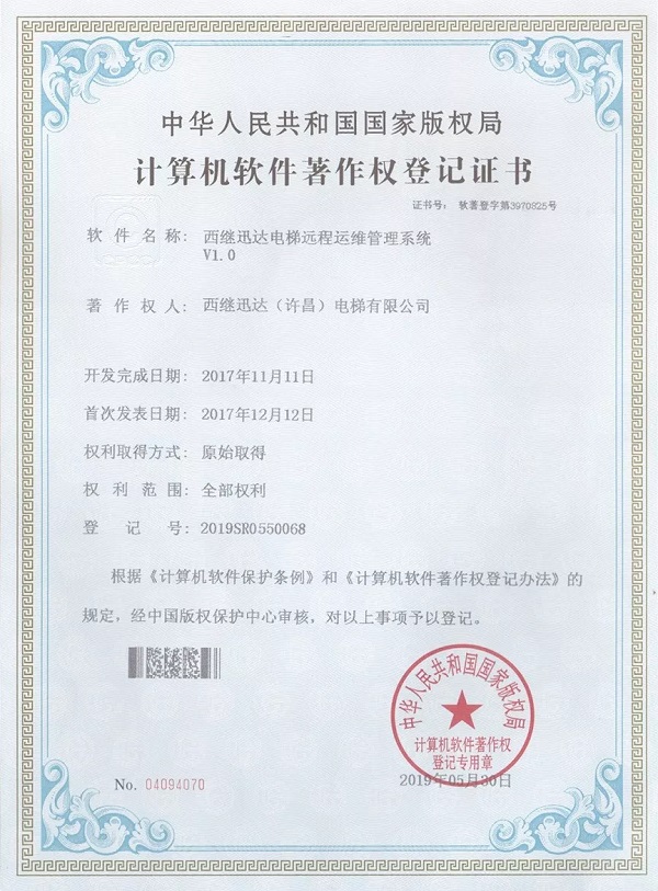 2019年5月30日,《西繼迅達(dá)電梯遠(yuǎn)程運(yùn)維管理系統(tǒng)》被正式授予《中華人民共和國(guó)國(guó)家版權(quán)局計(jì)算機(jī)軟件著作權(quán)登記證書(shū)》,登記號(hào)為2019SR0550068。